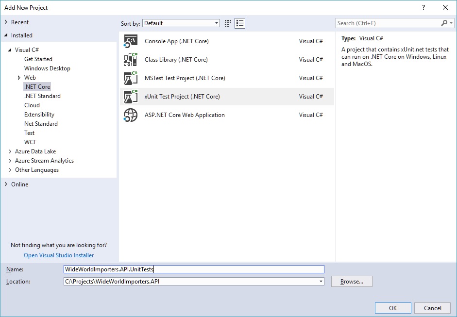 Visual C# > Test > xUnit Test Project (.NET Core)
