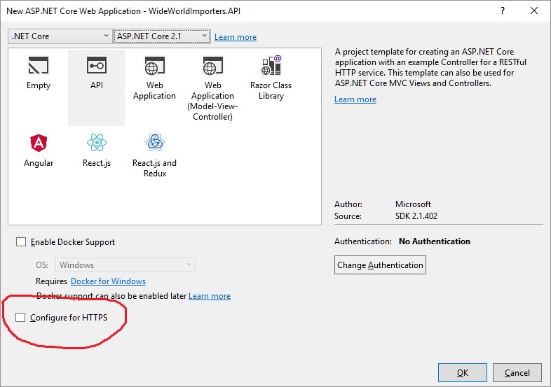 In the next window, select API and the latest version for .ASP.NET Core, in this case is 2.1: